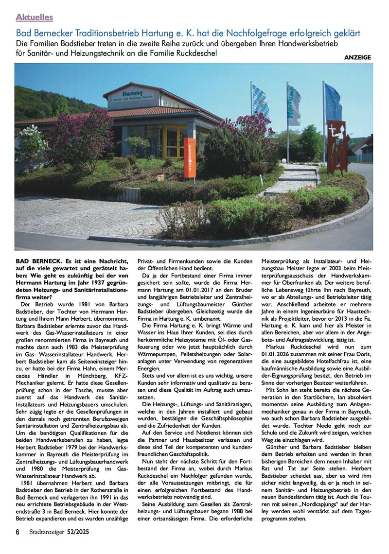 Bad Bernecker Traditionsbetrieb Hartung e. K. hat die Nachfolgefrage erfolgreich geklärt. Die Familien Badstieber treten in die zweite Reihe zurück und übergeben Ihren Handwerksbetrieb für Sanitär- und Heizungstechnik an die Familie Ruckdeschel…
